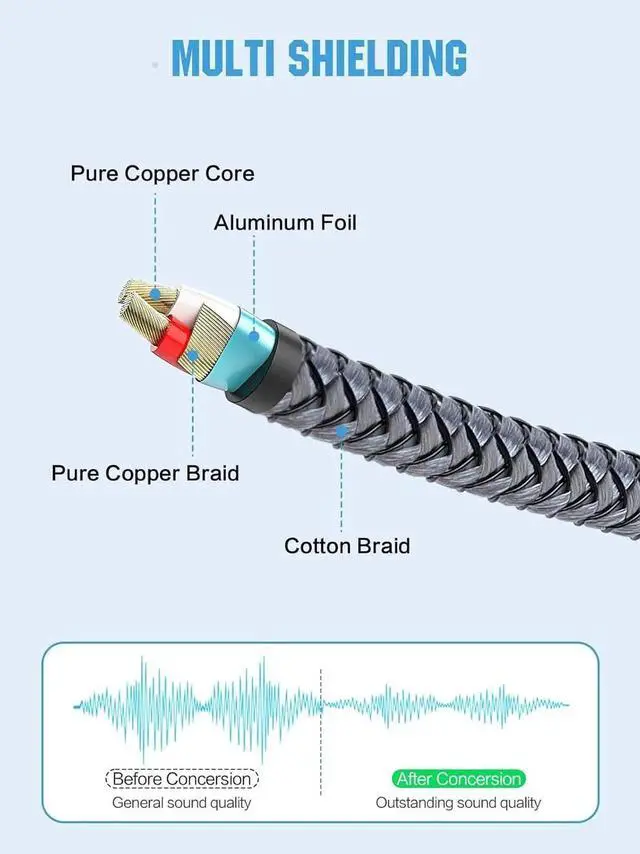 Wide Compatibility: 3.5 mm to 1/4 cable perfect for connecting devices between 3.5 mm (1/8 inch) and 6.35 mm (1/4 inch) audio ports. This auxiliary cord works with all devices with standard or recessed 3.5 mm dongle jacks such as iPads iPhones Galaxy Moto iPods MP3 players laptops PCs tablets home theater systems and speakers. It also allows seamless connection to professional equipment like mixing consoles amplifiers electric guitars pianos and studio headphones with 6.35 mm outputsDurability: This 3.5 mm to 6.35 mm stereo audio cable is durable and has been tested for more than 5 0000 bends to ensure long-lasting durability. The flexible nylon braided wire prevents tangling and this guitar cable is also wrapped in a high-quality aluminum shell which provides excellent protection from physical wear abrasion and pressure ensuring a strong and reliable connection during useLossless