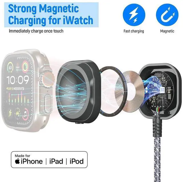 MFI Certified. Charging for iPhone iPad Watch and USB C devices with rigorously tested MFI certified 3 in 1 charging cable. Guaranteed compatibility with lightning fast charging and Watch magnetic chargers eliminating mismatched cords. Ideal for travel essentials offices or home setups its your multi-device charging solution with USB C to lightning cable support no overheating risksMilitary Grade Durability. Engineered with abrasion-resistant nylon braiding and dual aluminum alloy heads this USB C to lightning cable survives 30 000+ bends and extreme conditions. Compact for pockets yet tough enough for gym bags its the ultimate travel charger for multiple devices delivering reliable iPhone fast charging and Watch portable power for adventurers and busy householdsSmart Safety for Peace of Mind.