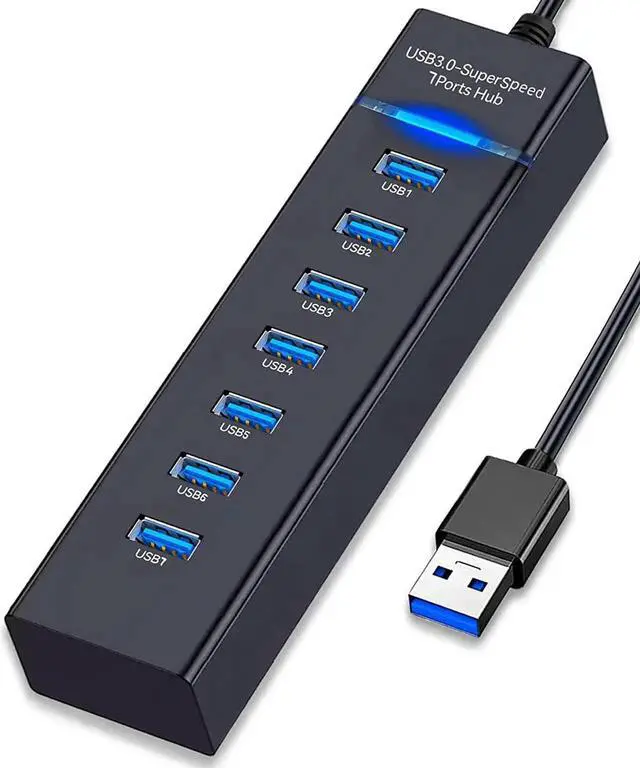Multiport USB Hub Extender Extend your one port into 7 USB 3.0 port for all kinds of USB devices -computer and laptop like flash disk mouse card readers keyboards gaming devices mp3 players HDD etc. Super-speed Data Transfer Using this USB hub 3.0 to transfer data at blazing speeds up to 5Gbps 10x faster than USB 2.0 fast enough to transfer HD movie or large files in seconds. Secure transmission of data Build-in advanced chip to avoids over current over voltage short circuit and high temperature safeguard your valuable data and USB gadgets. Plug and Play This USB Splitter doesn't need additional driver or software it is designed to be compact and lightweight making it portable and easy to use.