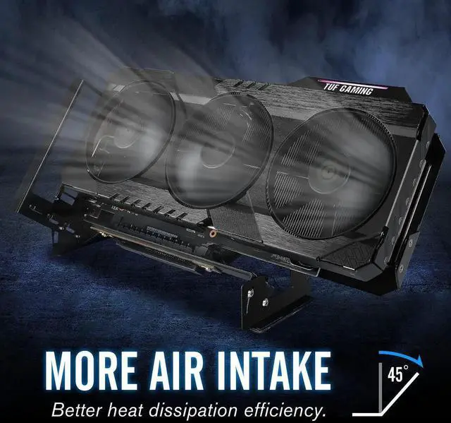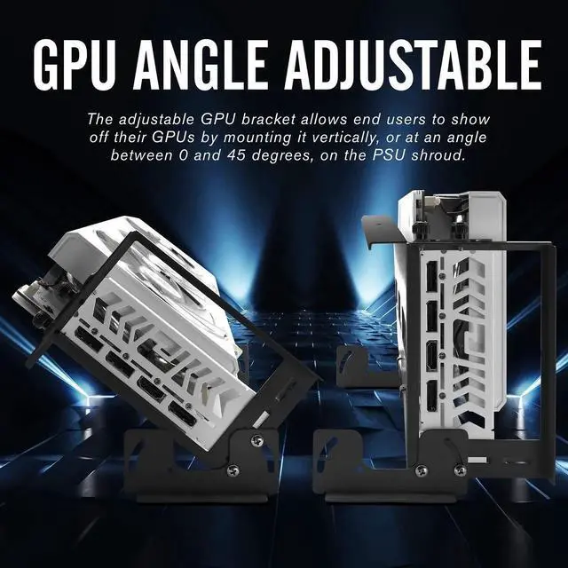 The adjustable GPU bracket allows to show off their GPUs and enhance cooling efficiency by mounting it vertically, or at an angle between 0 and 45 degrees, on the PSU shroud or any metal plane.