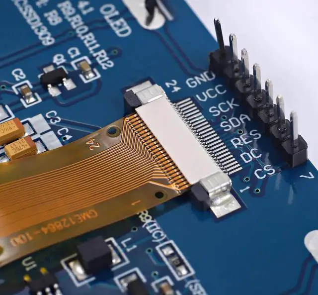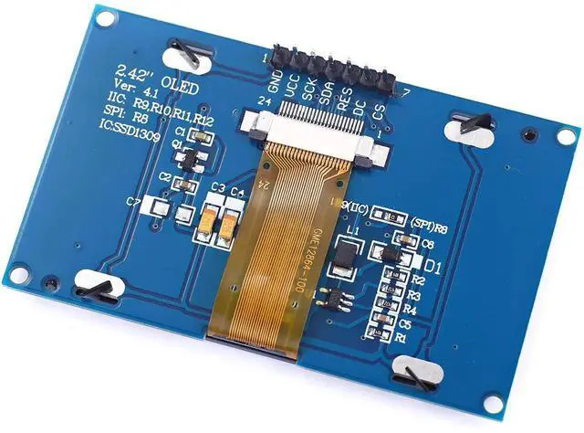 Features: Diagonal Screen Size: 2.42" Resolution: 128 * 64 Driver IC: SSD1309 SPI interface definition: 1.GND (power ground) 2.VCC (power supply positive) 3.SCL (clock line) 4.SDA (data line) 5.RES (reset line) 6.DC (data / command) 7.CS (chip select)