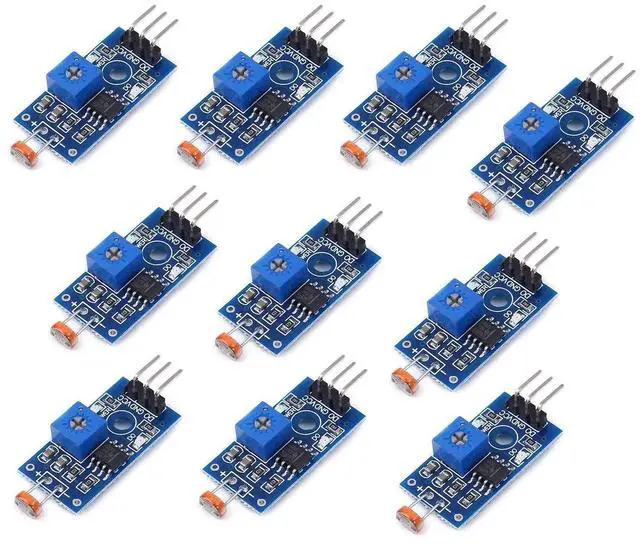 About us: Sensor performance and features: 1.Using sensitive photoresistor sensor. 2. Comparator output, the signal is clean, the waveform is good, the driving ability is strong, more than 15mA. 3.With adjustable potentiometer can adjust the detection light brightness 4 Working voltage 3.3V-5V 5.Output form: digital switch output (0 and 1) 6. With fixed bolt holes for easy installation 7 Small board PCB size: 32mm/1.26 x 14mm/0.55 8.Using a wide voltage LM393 comparator 9.Working temperature: -20 ° C ~ +55 ° C 10.Product weight: 3.5g 11.Application: Light intensity detection, intelligent car light module, with directional, only sense light source in front of the sensor, better to use for searching light. Package including: 10 x sensor module Module instructions 1.The photoresistor module is most sensitive to ambient light, generally used to detect the brightness of the surrounding environment, triggering a single-chip or relay module; 2. When the brightness of the ambient light reaches the set threshold, the DO end outputs a high level. When the ambient light brightness exceeds the set threshold, the DO end outputs a low level; 3. The DO output terminal can be directly connected to the single-chip microcomputer, and the high-low level is detected by the single-chip microcomputer, thereby detecting the change of the light brightness of the environment; 4. The DO output terminal can directly drive the relay module of the store, which can form a light control switc