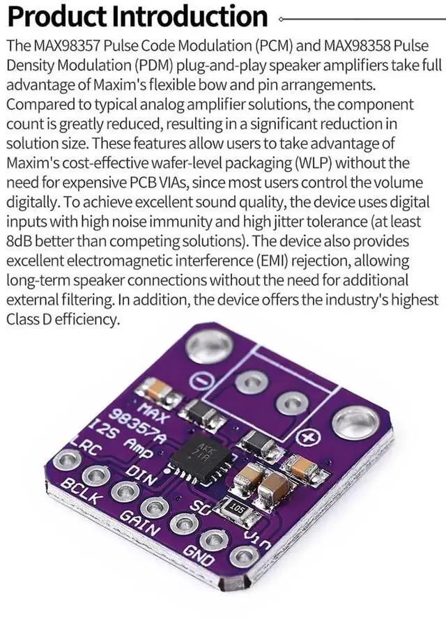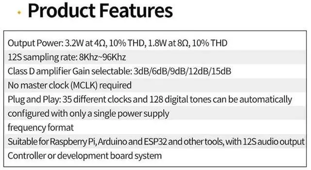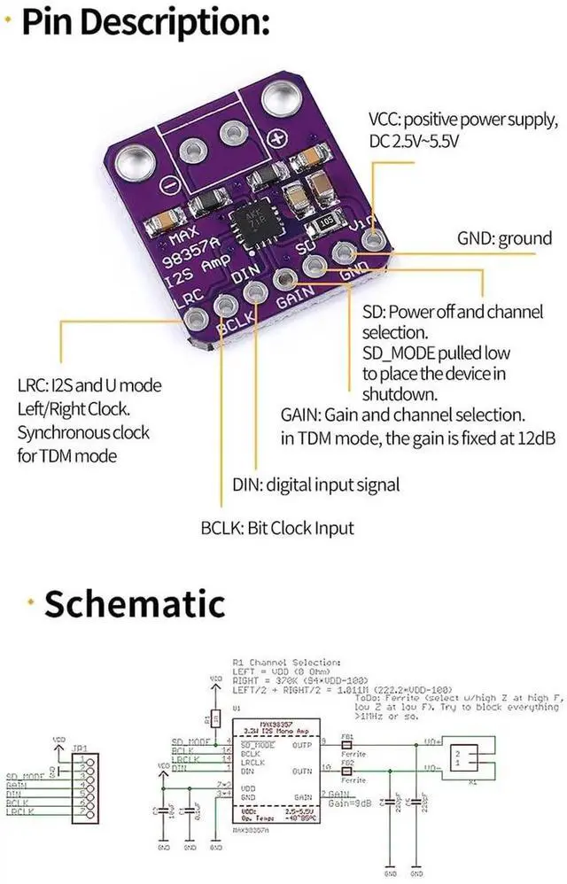 VCC: Positive power supply, DC 2.5V~5.5V GND: ground SD: Power off and channel selection. SD MODE is pulled low to place the device in shutdown. GAIN: Gain and channel selection. In TDM mode, the gain is fixed at 12dB DIN: digital input signal BCLK: Bit Clock Input LRC: Left/Right clock for 12S and LJ modes. Synchronous clock for TDM mode