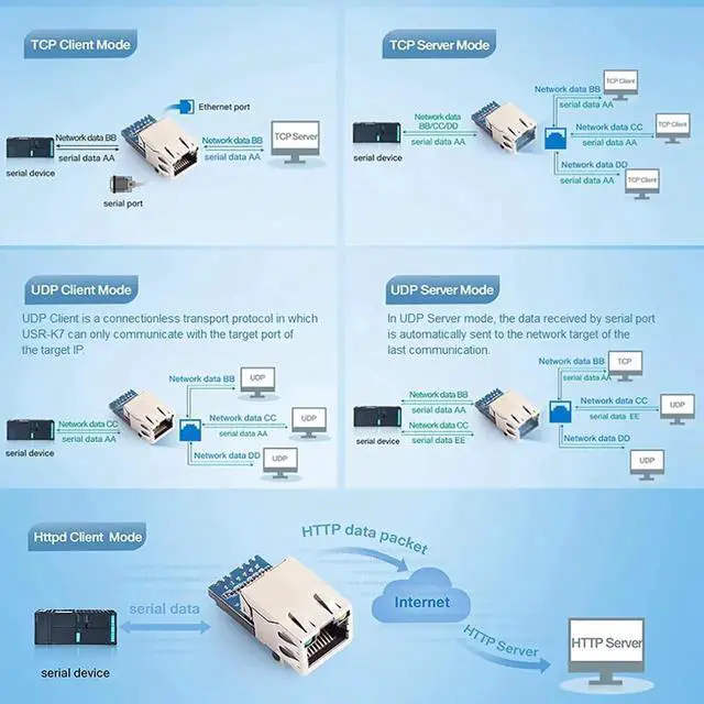 *Function* - Supports TCP server/client, UDP server/client,https client, Virtual COM.Supports 10/100Base-T(X) self-adaptive Ethernet interface.Supports flow control CTS/RTS, XON/XOFF.Hardware watchdog;TI Cortex M4 Solution;MQTT/SSL special firmware.