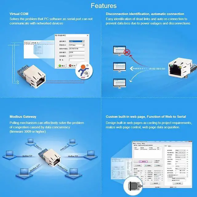 *Disconnection Identification, Automatic Connection.* - Can easily identificate the dead links and auto re-connection to prevent data loss due to power outages and disconnections. Custom built-in web page, support Web to Serial.Design built-in web pages according to project requirements,realize web page control, web page data acquisition.