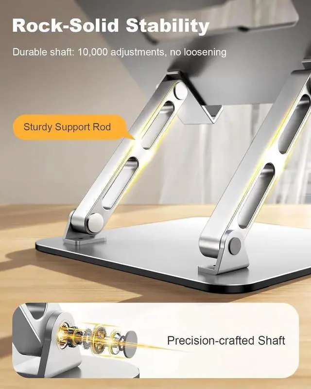 Ergonomic Design for ComfortTired of back pain from long hours at your desk? Our laptop stand features adjustable height ( 1.88 - 9.88 ) and angle to align your screen perfectly with eye level. Whether working indoors or outdoors this helps you maintain a neutral spine position while typing - dramatically reducing neck and shoulder strain. Stable & Secure SupportEngineered with a dual rod support and industrial-grade bearings this laptop stand for desk maintains military-grade stability through 10 000 adjustments. In addition it features a non-slip silicone pad that protects the laptop from scratches and holds it in place.