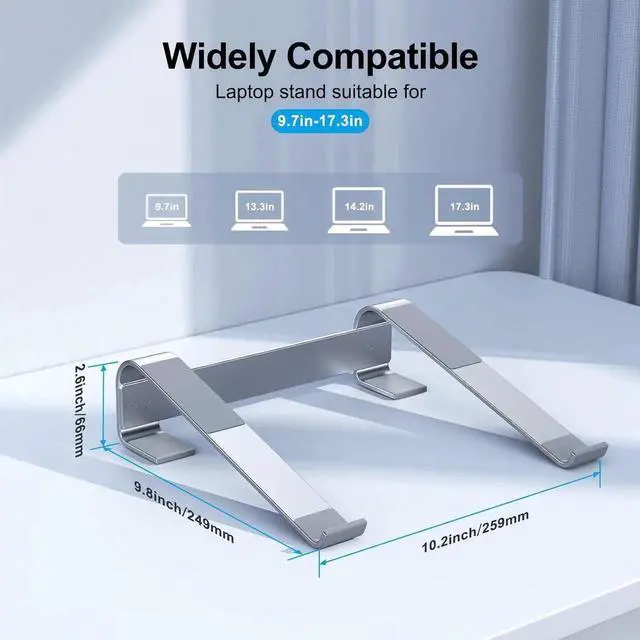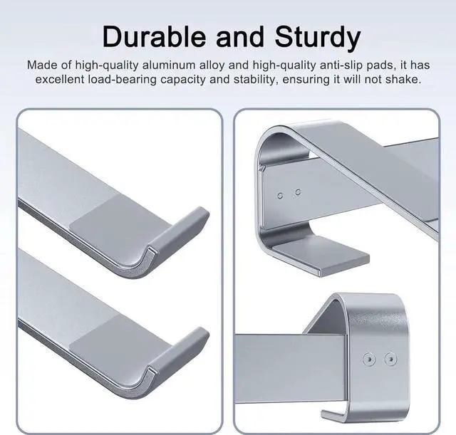 Ergonomic DesignThis ergonomic laptop stand follows ergonomic principles by raising the laptop screen by 2.5 inches and raising the keyboard by 17 degrees achieving a perfect line of sight and comfortable typing angle. This helps correct your posture and reduces neck shoulder spine and wrist pain. Whether you use a laptop at home or in the office you can enjoy a comfortable work experience. Stable and Robust Aluminum Alloy StandThe laptop stand for desk is designed with a triangular structure and a four-point force model which provides excellent load-bearing capacity and stability ensuring that it will not rock or sway.