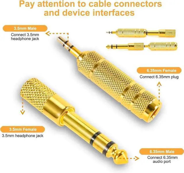 MULTI-FUNCTIONAL COMBINATION: This product has 4 adapters divided into 2 types 2 of each type. Among them the 6.35 mm male to 3.5 mm female plug adapter is suitable for accessing audio devices with 6.35 mm plugs such as amplifiers electric guitars/pianos stereo systems and so on. And the 3.5 mm male to 6.35 mm female plug adapter is suitable for connecting 3.5 mm (1/8-inch) stereo equipment to headphones with standard 6.35 mm (1/4-inch) plug.