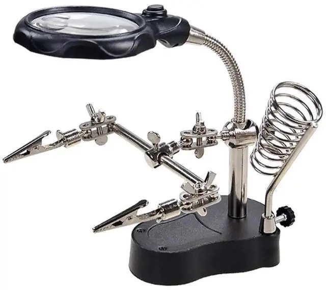 Equipped with flexible auxiliary holding clips, it securely fixes circuit boards, components and tiny parts, allowing fully hands-free operation for soldering, wiring and assembly. The stand and lens angle are fully adjustable to suit different working positions and user preferences.