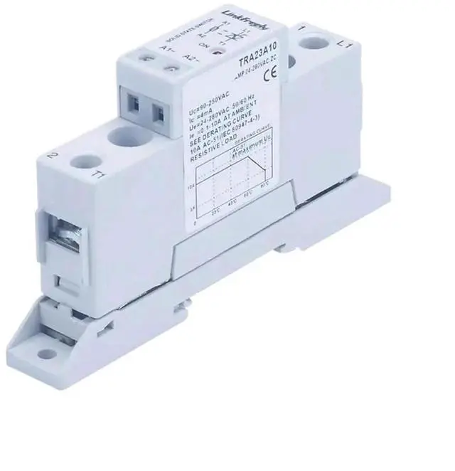 This TRA23A10K solid state relay module supports AC control AC with input voltage 90-250VAC and load voltage 24-280VAC at 10A. It features DIN rail installation, zero-crossing switching, and high reliability for industrial control, home automation, and electrical equipment control systems.
