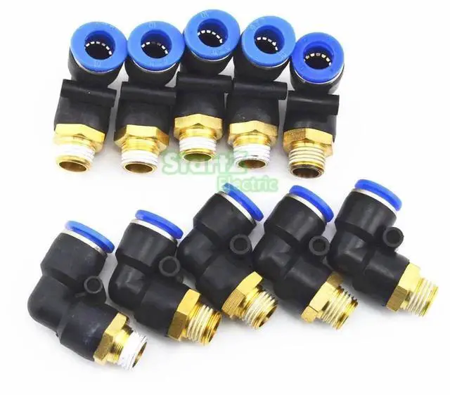 This set includes 10 pieces of 90° male elbow push-in pneumatic fittings. They connect 10mm pneumatic tubing to 1/4" threaded ports, widely used in air lines, pneumatic cylinders, and industrial automation equipment for stable and convenient air supply connection.