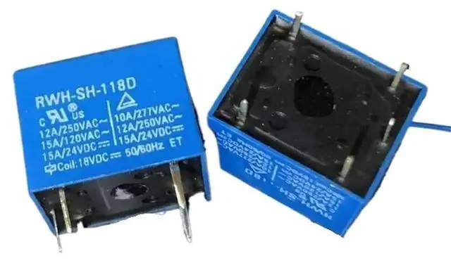 This is a 5-pin power relay with model RWH-SH-118D (18V) and specification T73C-12A.