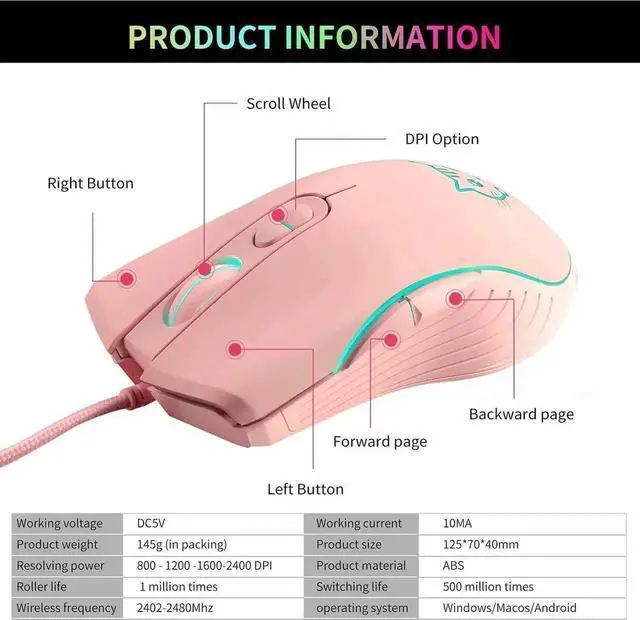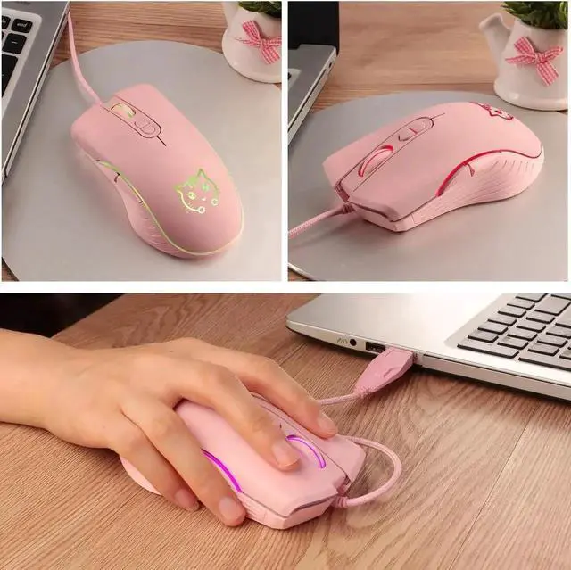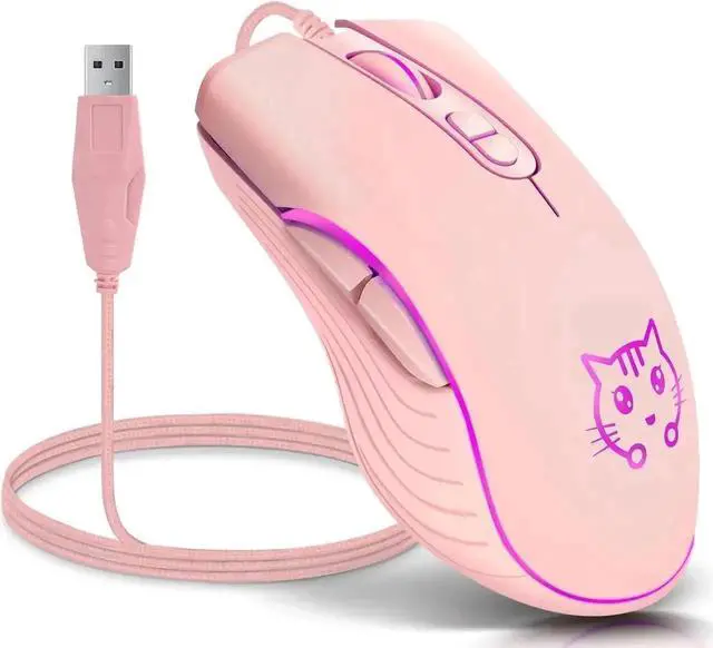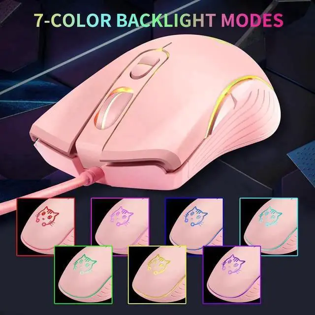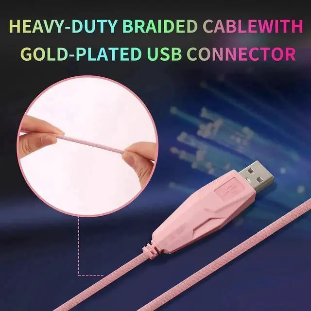 ergonomic wired gaming mouse comes in a stylish pink finish with stunning 7-color RGB backlighting, adding vivid visual flair to your desktop setup.