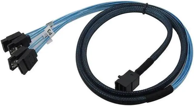 internal HD Mini SAS SFF-8643 to 4 SATA forward breakout cable connects an SFF-8643-equipped RAID controller or motherboard to four SATA hard drives/SSDs or a SATA backplane.