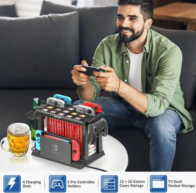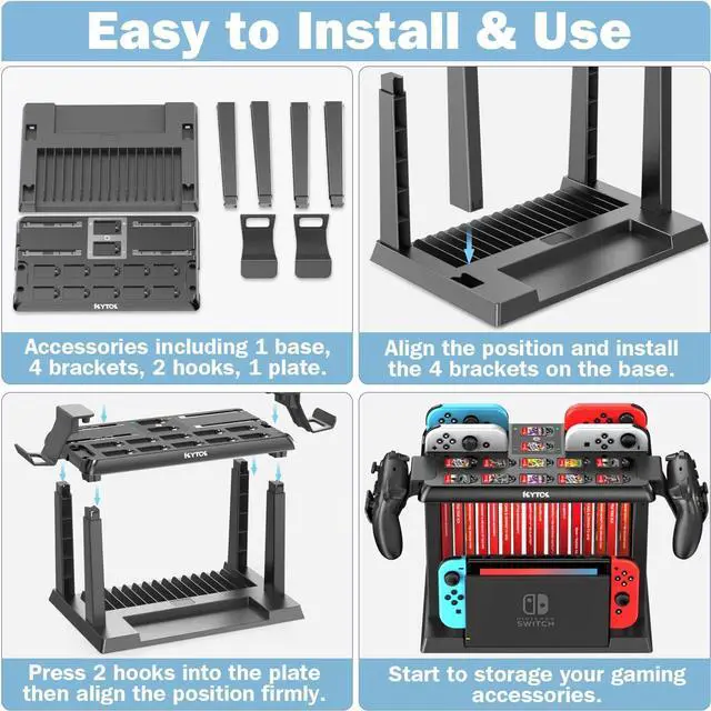 • All-In-One Switch OrganizerIn addition to charging 6 Joycons, Kytok Switch storage tower is upgraded with powerful storage space, including 28 game cards, 2 Pro controllers and your favorite Switch OLED Dock. Featured with versatile design, extra storage for nintendo switch make your game area clean and tidy.
