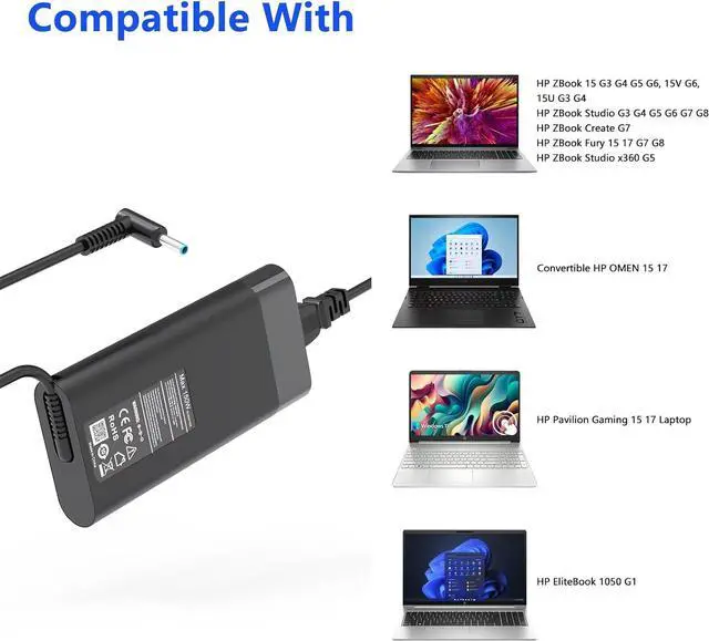 150w Zbook Laptop Charger Compatible ModelsCompatible for 19.5V 17.7A 150W ZBook 15 G3 G4, ZBook 15u G3 G4, ZBook Studio G3 G4 G8, ZBook Power G7, EliteBook 1050 G1, EliteBook 855 G7, HP Pavilion 15-bc400, Pavilion Gaming 17-cd0000, Pavilion 15-bc251nr 15-bc220nr, 15-ax043dx 15-ax256nr 15-ax250wm 15-ax243dx 15-ax001ns 15-ax033dx, 15-dc0010nr 15-dc0091cl 15-dc0020nr 15-dc0085nr, Omen 15 5100 5200, 15-5010nr 15-5210nr 15-5220nr, 17-an110nr 17-w033dx 17-w053dx 17-w253dx 15 5000 5100 5200 15-ax043dx,