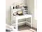 Storage & Organization: Features a hutch with partitioned shelves for supplies, plus a cable management hole to keep wires tidy.