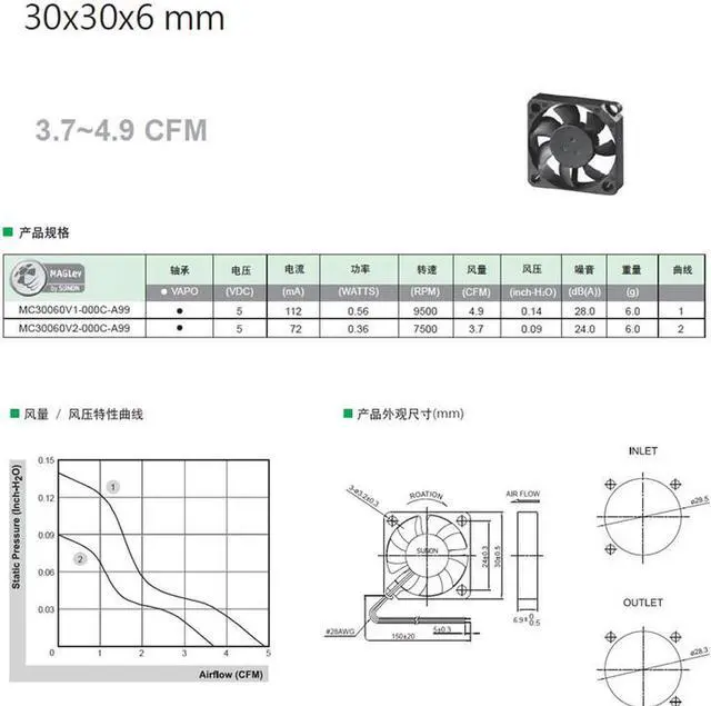 Brand: For Sunon Dimension mm: 30 x 30 x 6 mm Model: MC30060V1-000C-A99 Form: magnetic levitation Voltage V: 5 Current AMP: 0.112 Power W: 0.56 RPM: 9500 Air volume CFM: 4.9 Wind pressure Inch-H_2O: 0.14 Noise dBA: 28 Weight g: 6