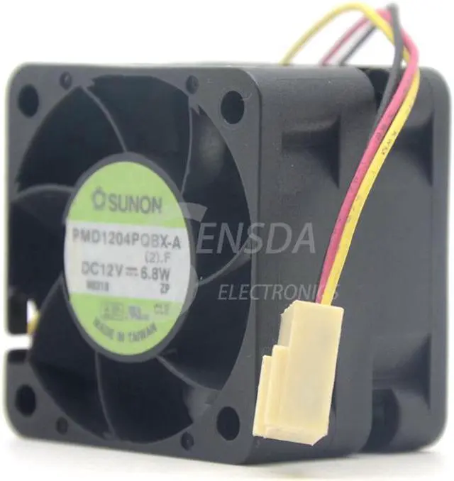 Sunon PMD1204PQBX-A Size40x40x28mm BearingDual Ball Rated voltage: 12V Power; 6.8W Operating Voltage 4V-13V Electric current 0.57A Speed 8500rpm Air volume: 18.5 CFM Pressure: 1.06 Standard three -pin motherboard connector