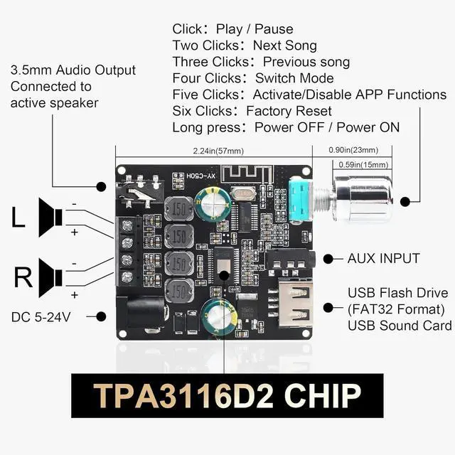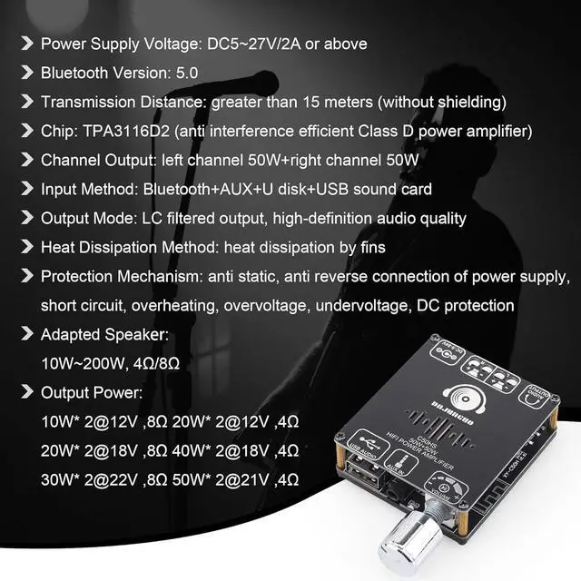 The C50HS is a HIFI stereo Bluetooth power amplifier board that is designed to deliver exceptional audio quality. With an output power of 50W+50W, it has a TPA3116D2 chip that provides high-efficiency performance and low distortion. It features multiple input methods, including Bluetooth, 3.5 mm AUX input, USB flash drive (FAT32 format), and USB sound card input, making it versatile and compatible with a variety of devices.