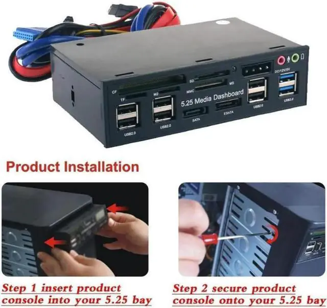 Packagelist: 1 * 5.25" Internal SATA e-SATA Dual USB 3.0 Six USB 2.0 Five-in-one Card Reader Multi-Function Front Panel Media Dashboard 4 * Screw 1 *