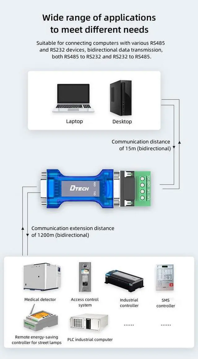 This compact converter provides a cost-effective solution for extending the communication range of RS232 devices, making it ideal for industrial monitoring, control applications, and equipment integration where long-distance data transmission is required.
