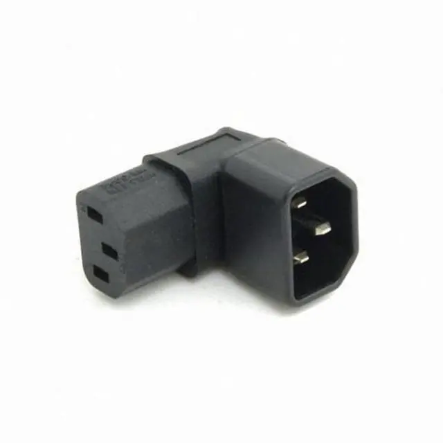 An angled power connector. The plug type for this adapter is IEC 320 C14 to C13, featuring a 90-Degree Angle AC Converter design with an IEC 3-Pole Male to Female 90-Degree Angle Configuration.