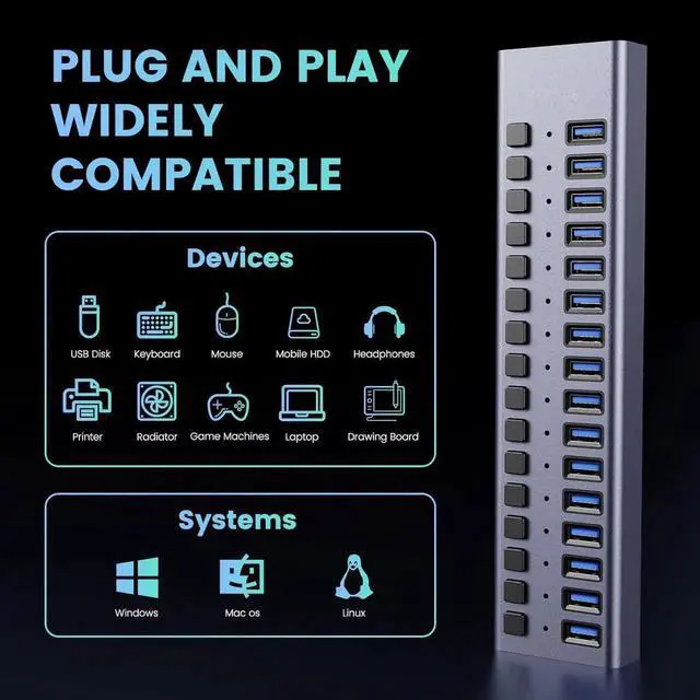 16-In-1 Powered USB Hub: Powered USB 3.0 hub with 16 USB ports, could expand 1 USB port to 16 external USB 3.0 data ports for keyboard, mouse, card reader, hard drivers, USB Flash drive, printer and more, which will be a good substitute that can easily help you arrange your home and office.