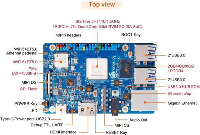 [Rich Peripheral Interfaces]: OrangePi RV offers a comprehensive range of peripheral interfaces, including PCIe 2.0, USB 3.0, Gigabit Ethernet, Wi-Fi 5.0 and Bluetooth 5.0, M.2 M-Key 2280, MIPI-CSI, MIPI-DSI, a 40Pin expansion port, a 3.5mm headphone jack, and Type-C 5V4A power supply. These interfaces provide extensive connectivity options, enabling the board to be integrated into various systems and applications.