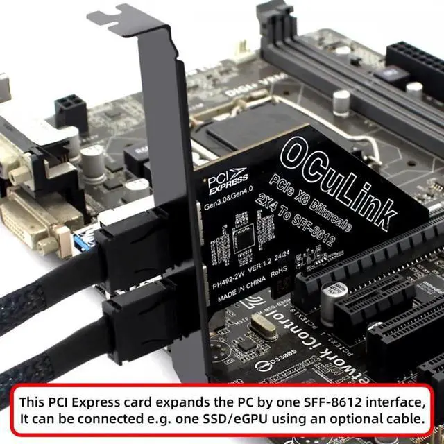 It can be connected e. g. one SSD or eGPU Graphics Card by using an optional cable. Suitable for small hosts, desktops, laptops, etc. to convert PCIE sockets to Oculink sockets, with fixing holes for fixing.