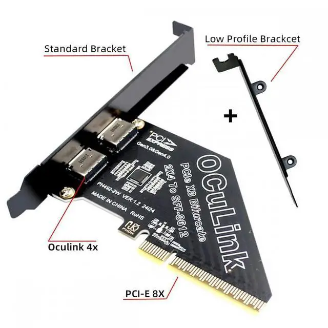 Connectors: Two external OCuLink SFF-8612 female and 1xPCI Express; with standard length and low profile bracket.