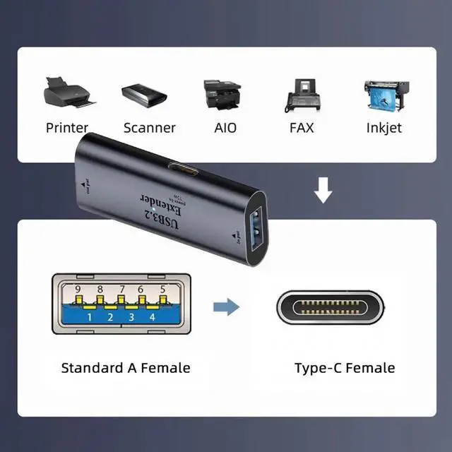 USB 3.0 Repeater Adapter Type-A Female to Type-C Female Extender with Chipset for Camera Printer Computer