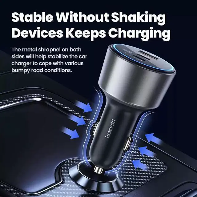 Features reinforced metal shrapnel on both sides that securely grips the car's power socket, keeping the charger stable even on rough or bumpy roads.