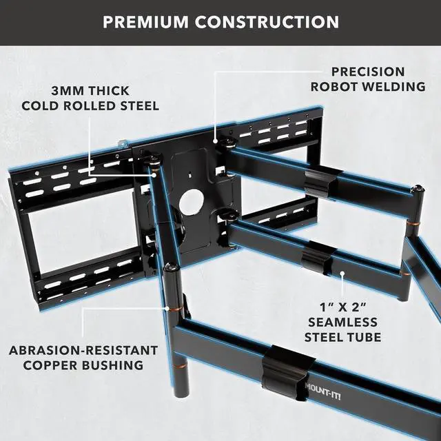 TANK TOUGH: HOLDS 275lbs and Up to 110in TVs - Our long articulating tv wall mount is a beast! Designed to provide stability for the Ultimate Cinema Experience. This full swivel tv wall mount was quality tested to hold 1100 lbs at once - so you can rest assured it will easily hold 275lbs. All high quality 4k, LCD, LED, QLED, and OLED TVs deserve our Mount-It! long arm tv wall mount.
