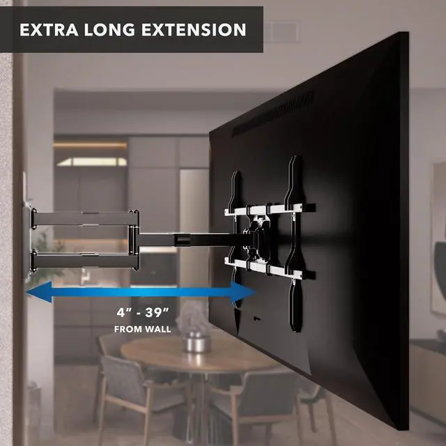 Perfect Viewing Angles: Our full rotation tv wall mount has a sliding wall plate to keep your TV centered in any position on the wall. Fully immerse yourself into any show, thanks to the 39 Inch long extension arm.