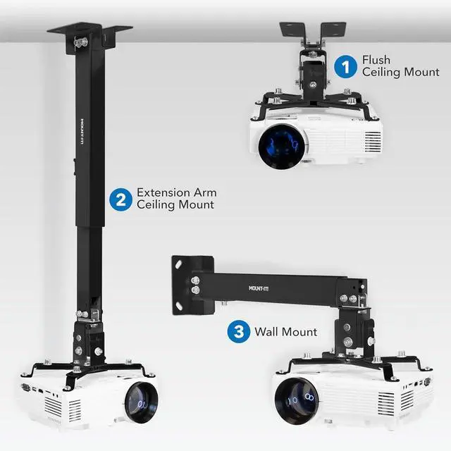 Versatile Installation: Use this universal projector mount for flush ceiling mount, telescoping arm ceiling mount, and wall mount configurations. Compatible with wood studs, concrete, flat ceilings, and more.