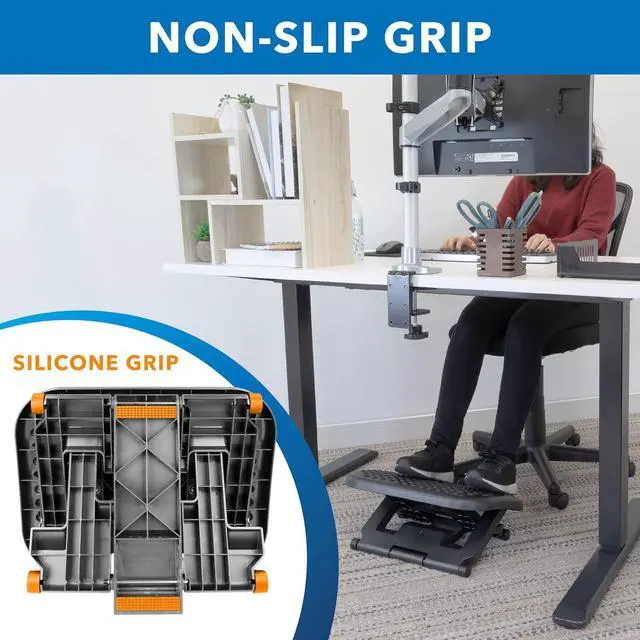ERGONOMIC OFFICE FOOT REST - Increase comfort at your desk. Keep legs and feet elevated for less strain and fatigue. Adjustable height and angle reduces pressure on lower back and alleviate discomfort while sitting.