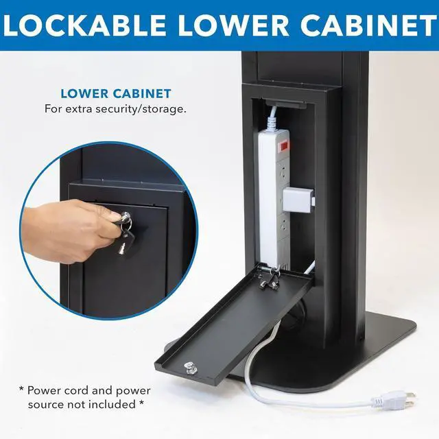 FLOOR STAND: Perfect iPad floor kiosk for trade shows, photo booths, hotels, libraries, retail & POS. The lockable design ensures your iPad is protected from tampering and theft. A built-in cabinet with lock allows for secured access to power supply.