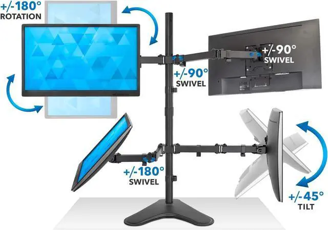 FULL MOTION MULTI SCREEN MOUNT: Each monitor arm moves freely, allowing you to find the perfect setup. 45 Degree tilt up and down, 90 degree swivel left to right and a full 180 Degree screen rotation for landscape or portrait orientation.