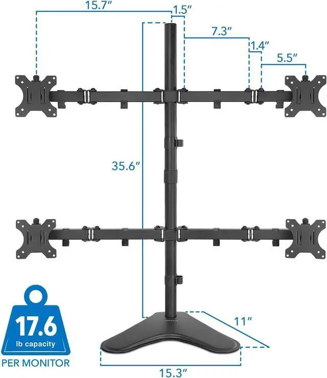 STURDY AND DURABLE: Steel monitor arms with a steel base for maximum stability. Don' t settle for less when mounting four screens. Supports screens up to 32" and 17.6 lbs per monitor. VESA compatible 75x75mm and 100x100mm.