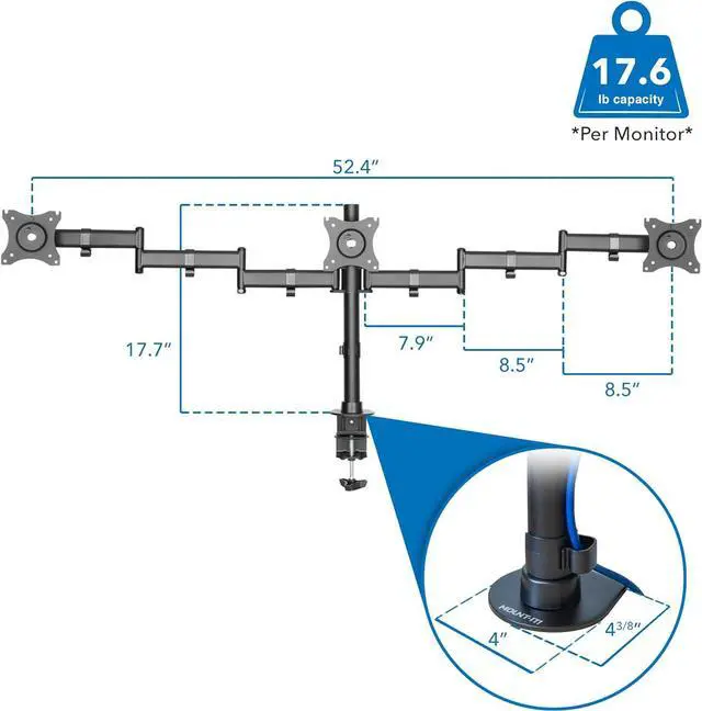 FEATURES: The full motion tri monitor desk stand is made of heavy duty steel and has integrated cable management clips on each arm to keep your cables organized. Comes with interchangeable C-clamp and grommet base mount for desktops up to 4 inches thick.