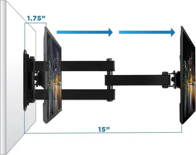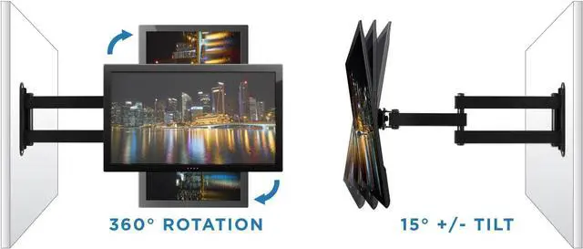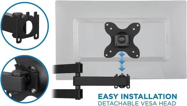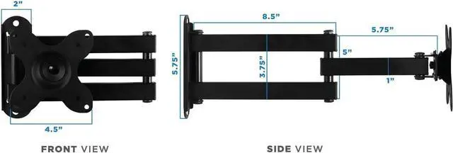 FEATURES: VESA wall mount arm can fold to bring the screen right up against the wall, or can extend out another 14 inches. The VESA plate head will tilt up or down 15 degrees or rotate 180 degrees to put screen in landscape or portrait orientation, and arm can swivel 180 degrees to left and right. Its sturdy construction holds up to a whopping 40 pounds!