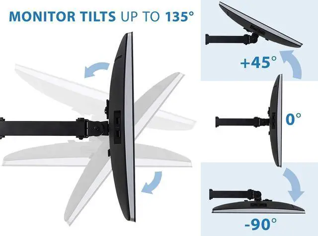 FULLY ADJUSTABLE: 2 of 3 monitor stand outer arms can tilt 45 degrees up and down from center, swivel 360 degrees, and raise and lower on the middle pole. Middle screen can be height adjusted, tiled, and swiveled as well. All 3 screens can be placed and held in portrait or landscape orientation independent of one another. TO ALIGN THE HEIGHT OF THE MONITORS, ROTATE THE HEIGHT ADJUSTMENT SCREW BEHIND EACH MONITOR VESA HEAD TO RAISE AND LOWER EACH MONITOR UP TO 1 INCH.