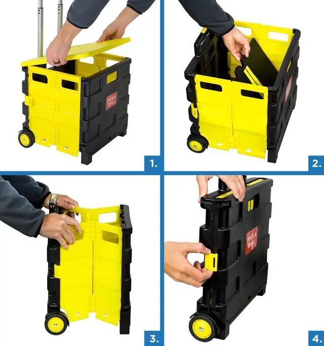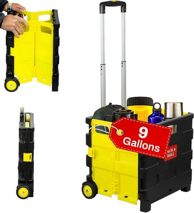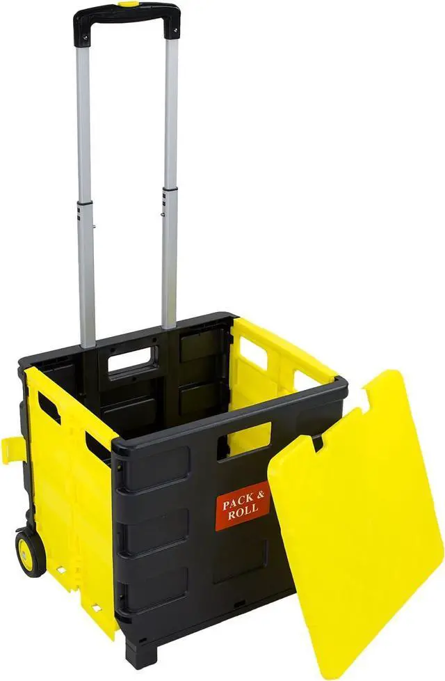 COLLAPSIBLE ROLLING CART WITH LID Lightweight yet sturdy, this rolling utility crate with a secure lid is perfect for transporting books, files, groceries, and personal items. Protect your belongings from dust and weather while reducing strain on your back.