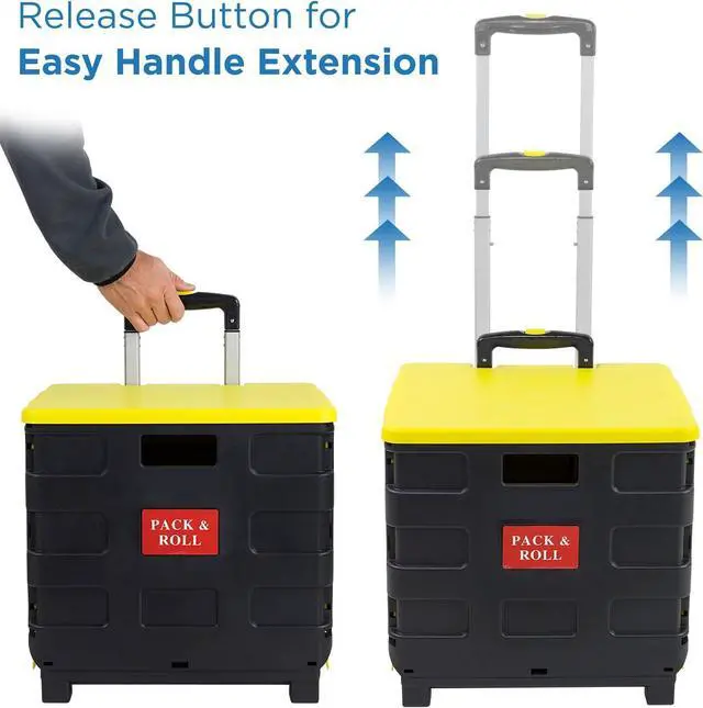 ERGONOMIC TELESCOPING HANDLE The handle extends up to 34 inches and features a contoured grip for comfort and better control, making it easy to use as a rolling crate for groceries, office supplies, or teacher cart essentials.