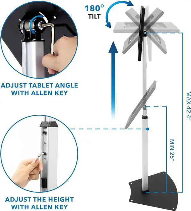 VERSATILE IN MANY WAYS: This tablet mount is height adjustable from 26.8 " to 42.5 " which ensures you can engage with users of any age and size. In addition, the iPad stand comes with an up to 90 degree tilting head that allows to reverse the screen between users.