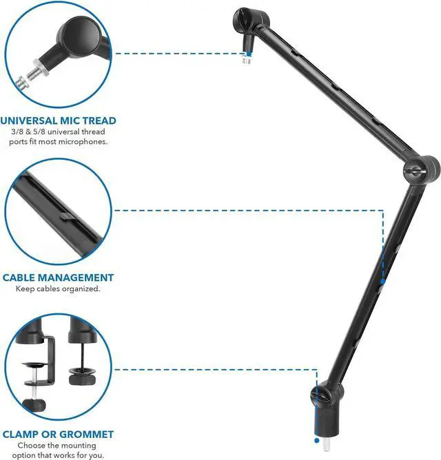 UNIVERSAL COMPATIBILITY: The boom mic arm can attach your Blue Snowball or Blue Yeti along with most microphones with 3/8" and 5/8" threads (Microphone in picture not included).
