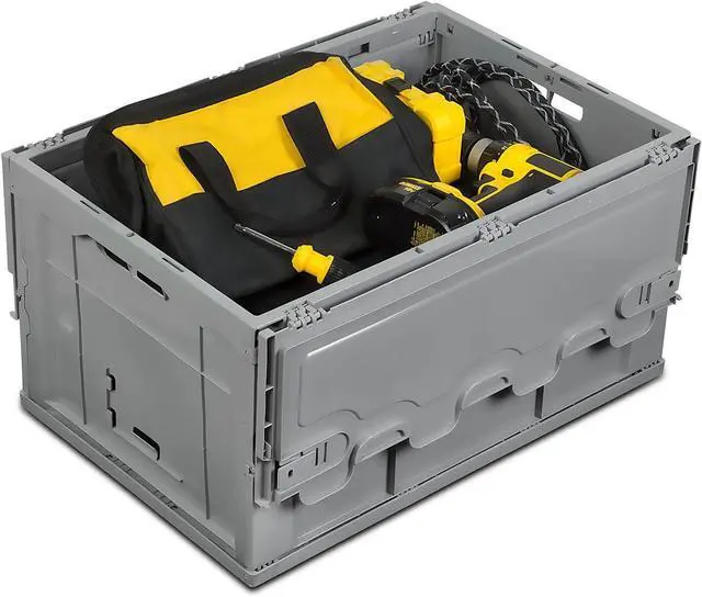 STACKABLE STORAGE. This collapsible bin has a nesting system for secure vertical stacking, dual sliding locks for the top flip cover, and label holders for bin identification