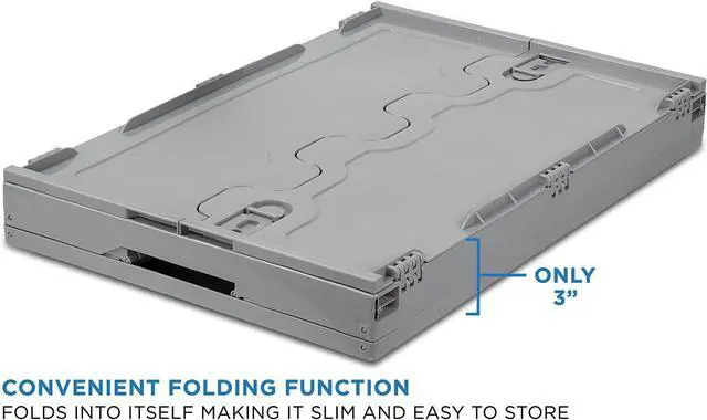 SPACE SAVING SOLUTION. Folds down to just 3 " making it easy to transport multiple bins in a car trunk or for compact storage in a closet, garage shelf, or warehouse