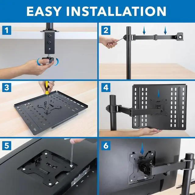 SPACE-SAVING DESIGN & EASY INSTALLATION: Maximize your desk space with our dual arm stand that fits 13-32" screens and laptops up to 17". The versatile C-clamp and grommet mounting system declutters and organizes your workspace, and installs in under 10 minutes.